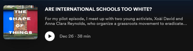 In this final episode of the first season, I met former international school students Clara Reynolds and Xoài David, two twenty-one year olds on a mission to decolonise the curriculum in the world of international education. Their movement began as “decolonise the IB” and is now the Organisation to Decolonise International Schools. It has taken hold and empowered other international school alumni, teachers and students. Released 31st July 2020